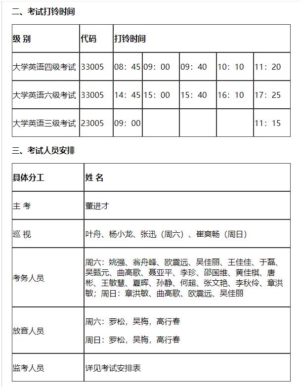 3、监考人员应认真履行监考职责,在考试前对考场进行彻底清场,考前在黑板上写明以下内容:考试时间、考试科目、学校代码四六级33005三级23005、校区代码0、考场号、学校调频72.8兆赫、相关注意事项(如禁止携带手机等通讯工具;考试中途不准离场等),监考过程中,手机须关机。